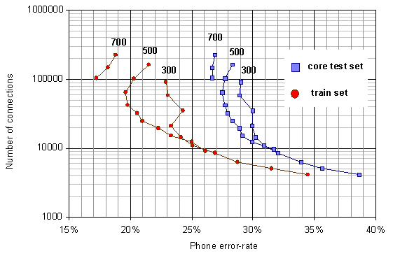 The focus in this paper has been on the low error-rates for the optimal, pruned networks with about 50,000 to 100,000 connections. However, the smaller, more aggressively pruned networks can also be useful, e.g., in an initial fast search in a multi-pass recognizer, or in cases when CPU time is limited. Better than 30% phone-error rate can be achieved with less than 15,000 connections.