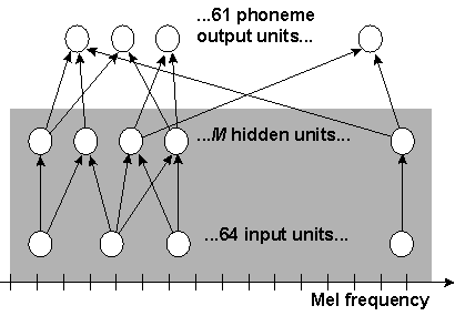 In this study we use a tonotopic metric for both the input and the hidden units. The structure of the ANN is outlined in Figure 2. The input units take the values of the 64 activities of a mel frequency filter-bank. Thus, a significantly more detailed input representation of the speech spectrum is used than what is common for contemporary ASR. The input units are ordered by center frequency, and the metric is simply defined by the position in the 1-dimensional input layer. The hidden layer of units is also 1-dimensional, and a metric on the M hidden units is defined by multiplying the unit's ordering number by 64/M. For example, hidden unit number 17 is located at 17 * 64/M in this metric. Thus, the metric of the hidden units is normalized such that the positions of hidden units are in the same range as input units. Like in the auditory nerve, a characteristic (mel) frequency can now be associated with each hidden unit. We define a tonotopic connection scheme by letting the connectivity for connections between the input layer and the hidden layer be a decreasing function of the distance between the units.