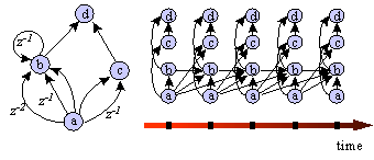 and the same network unfolded in time (right) where the units a-d are duplicated