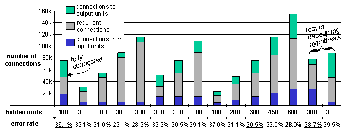 In RNNs, the number of connections is proportional to the square of the size of the hidden layer (the second term of (3)). Thus, for large hidden layers, a very low connectivity is necessary to reduce connections to a manageable number. This reduces the network's functional capacity more than can be compensated for by the increased number of hidden units.